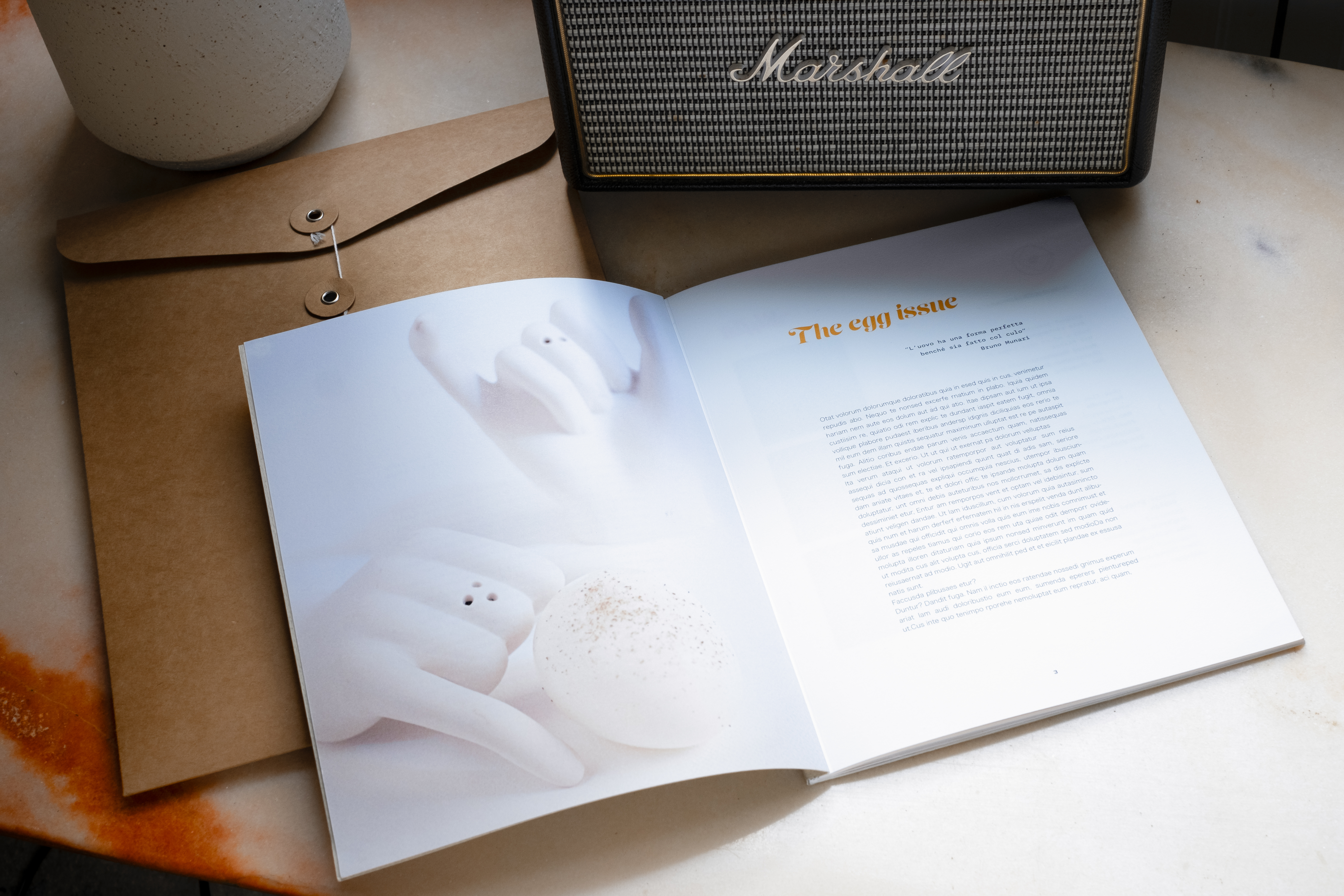 La carta scelta per la copertina richiama il paper pulp delle scatole di uova con la tipica perdita di informazione tipografica. Per l’interno ovviamente è stata scelta carta egg shell.